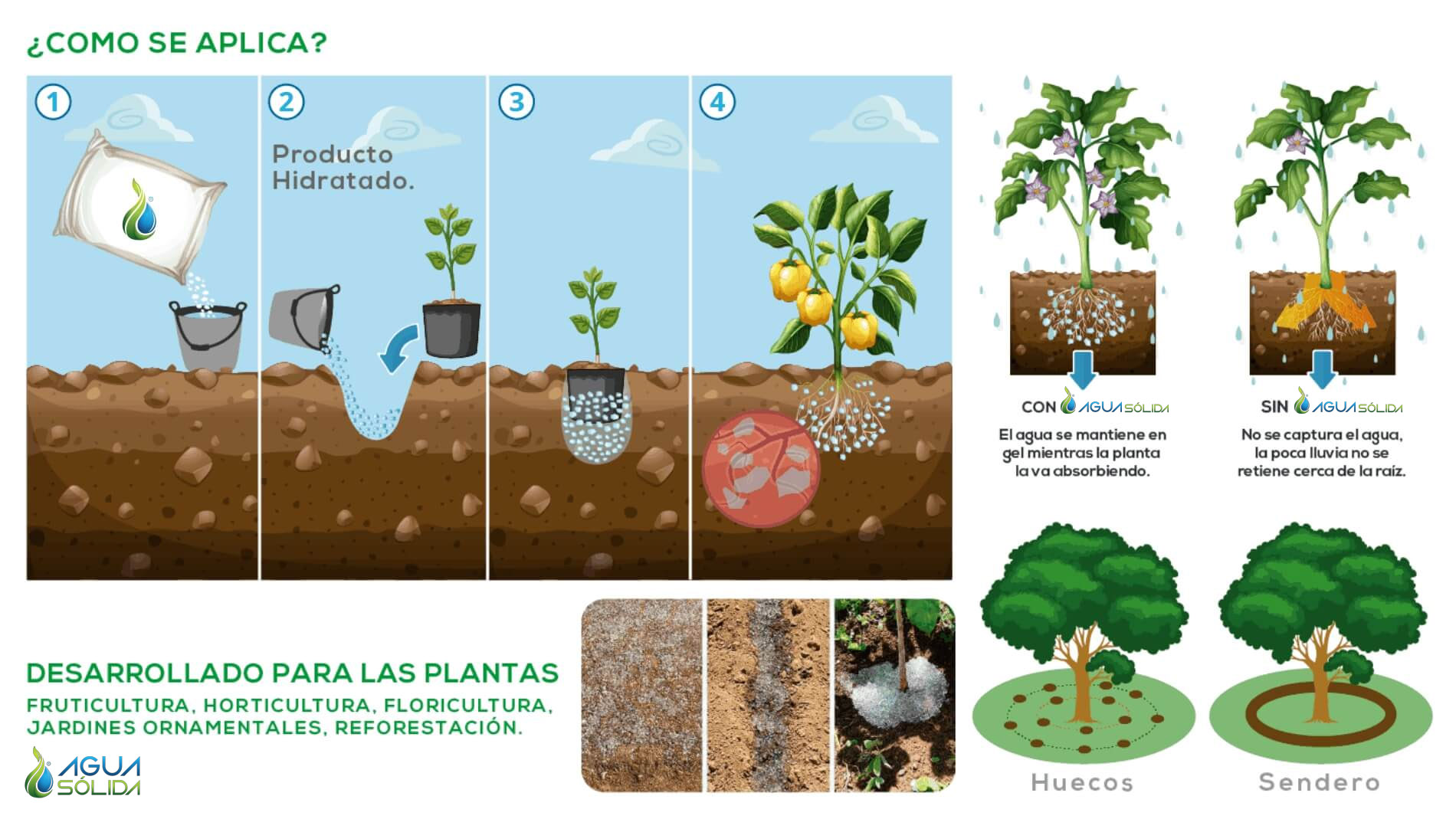 "El Agua Sólida es un insumo altamente rentable. En términos generales, se utiliza una dosis de 100 gramos por árbol, 1 gramo por planta de maíz y 30 gramos por metro cuadrado de césped. Las dosificaciones pueden variar según el tipo de suelo, la densidad de la plantación, la edad de la planta y otros factores técnicos."